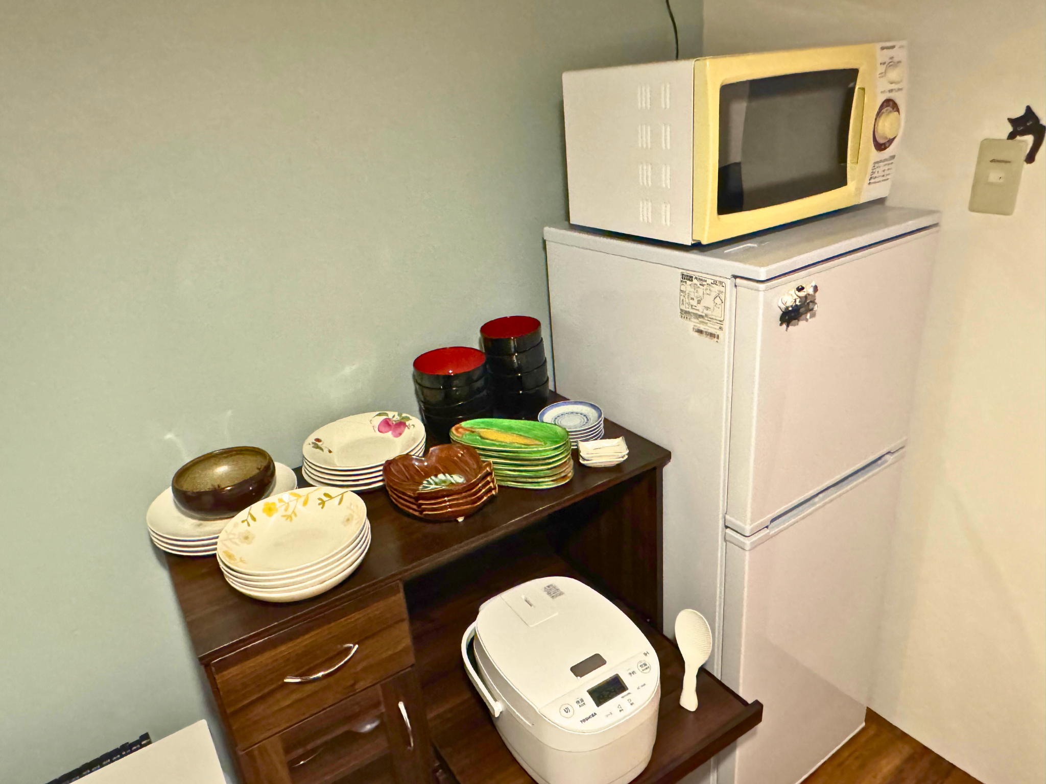 | キッチン・ダイニング | 冷蔵庫、2口IHコンロ、電子レンジ、炊飯器、電気ケトル、調理道具、皿、コップ各種、フォーク、スプーン、箸、ナイフ |